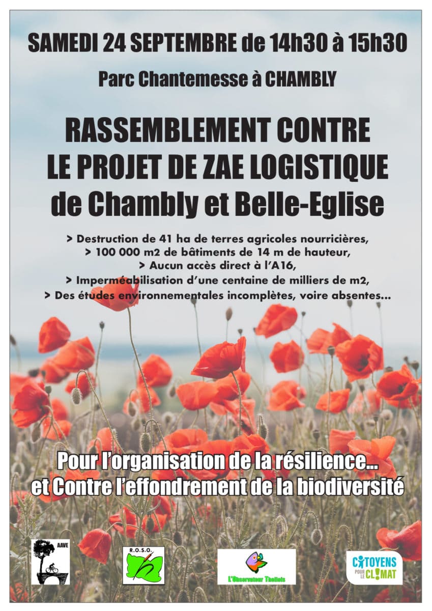 En savoir plus…Samedi 24 septembre à 14h30 au Parc Chantemesse à Chambly RASSEMBLEMENT CONTRE le projet de ZAE LOGISTIQUE de Chambly et Belle-Église